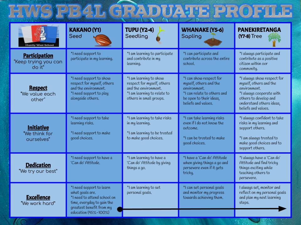 At Huntly West School our PRIDE values are Participation, Respect, Initiative, Dedication and Excellence.  The expectation for each value is displayed on our website and throughout the school. We focus on different values each term with a school wide commitment to ensuring we aspire to each one.
